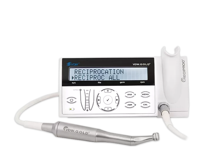 System VDW Gold Reciproc to specjalistyczny mikrosilnik endodontyczny zaprojektowany do pracy zarówno w ruchu recyprokalnym, jak i obrotowym ciągłym, dedykowany do pilników systemu Reciproc.